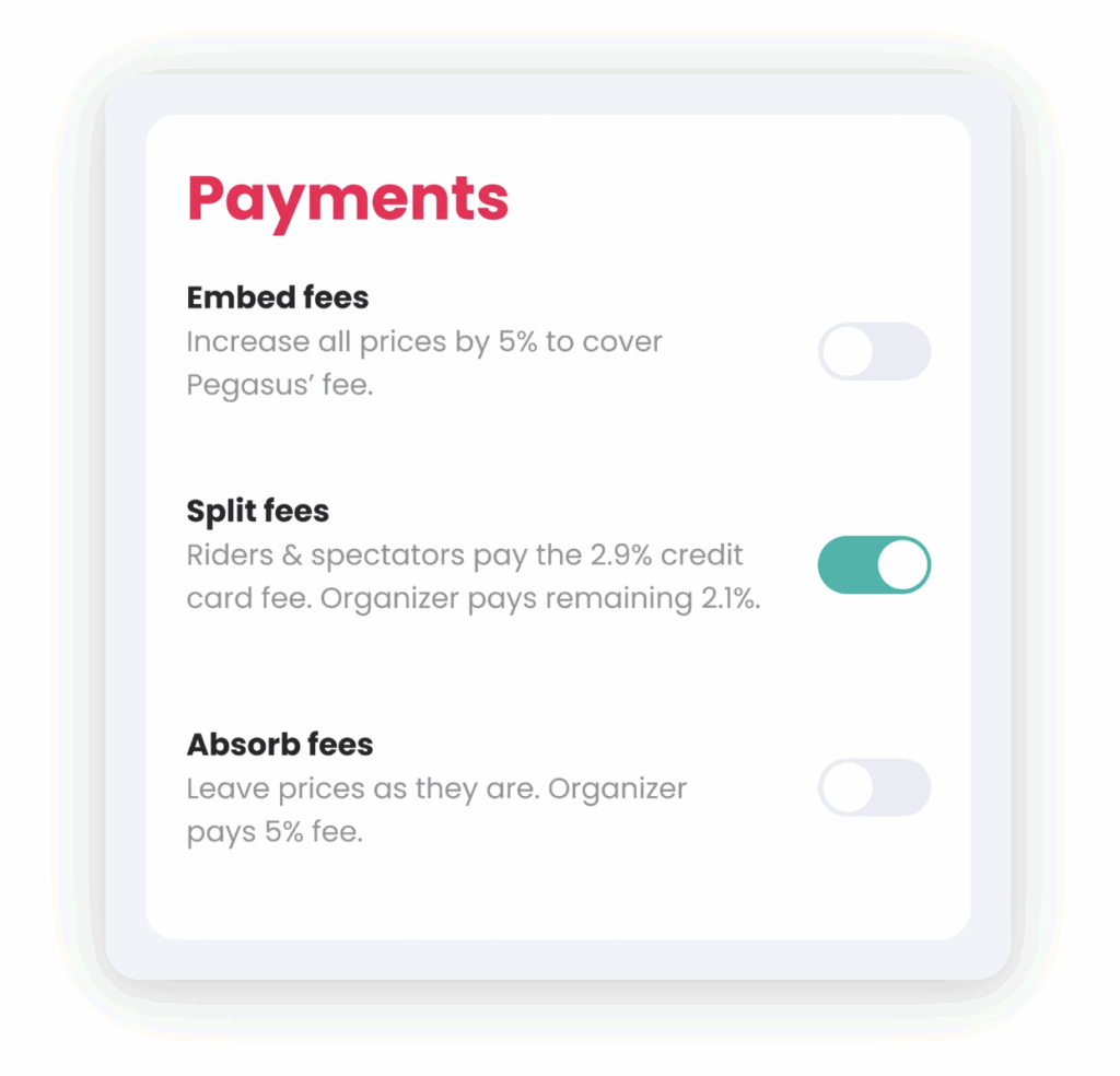 Show managers can choose to embed the fee into entry prices, split the fee with riders, or absorb the fee and pay it from show revenue. This flexibility allows small and regional shows to protect margins and choose the option that best fits their community instead of being forced into a single pricing structure.