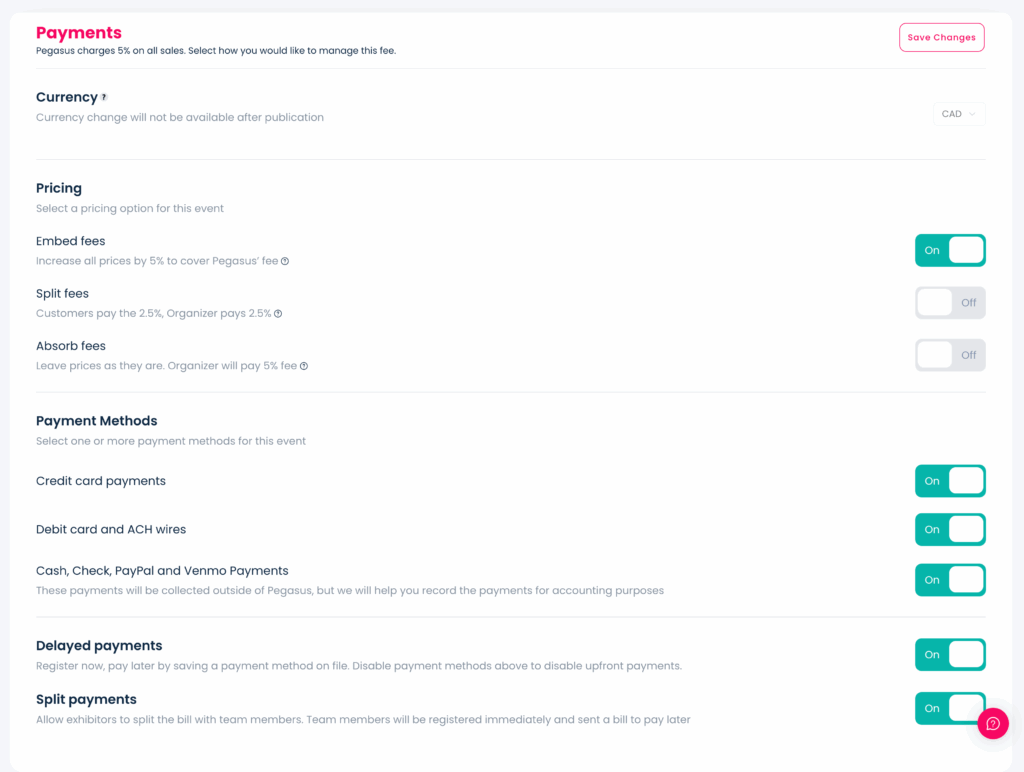 Pegasus only charges a transaction fee on online payments processed through the platform. If a show accepts payments outside Pegasus – such as cash, check, PayPal, Venmo, or wire transfer – the platform can be used entirely for free.